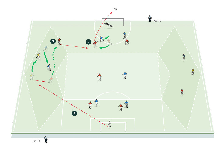 Om en spelare går in i boxen måste sidospelarna från det försvarande laget låta angriparen gå och det kommer att finnas en 3mot2 situation i boxen som angriparna måste utnyttja för att göra mål. Om de blå försvararna återhämtar bollen kan de motanfalla i mittenområdet och det röda laget måste ha resten försvar för att motverka. Om det attackerande laget gör mål eller bollen går ut efter att de dribbla in i boxen, kommer assisterande tränaren på sidan av målet att sparka en boll länge så att det röda laget måste ha resten försvar för att motverka.