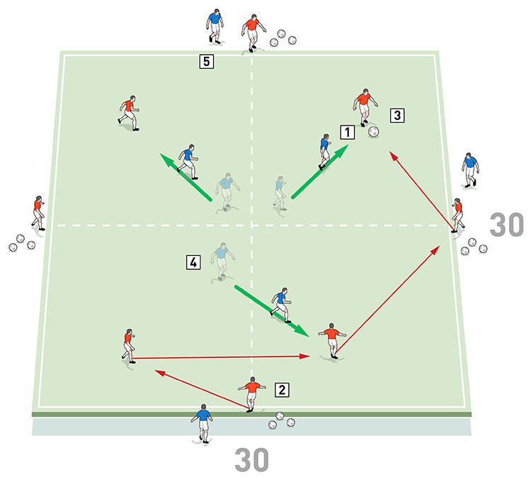 5.Aktiviteten kan utvecklas med tillägget av tre blå väggspelare till utsidan för att hjälpa pressarna att hålla bollen om de vinner den.