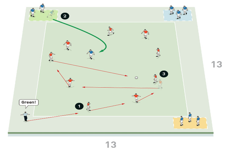 2.Tränaren ropar ”grön” och en försvarare från det gröna torget går in i området för att se till att vinna bollen tillbaka.