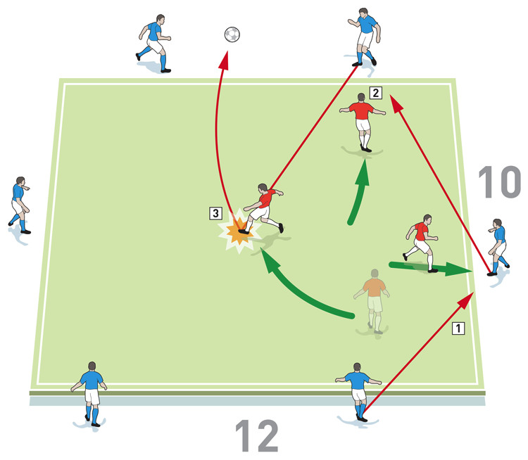 2.De tre insiderspelarna måste försöka pressa, blockera och bryta passen.
