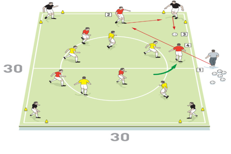 Denna övning är inställd som visas,spelar 5mot5 3x2min spel och involverar spelare som går all in. Fyra målvakter placeras i de fyra hörnen, var och en begränsad till att spela ett tillslag. Det är ett enkelt besittningsspel mellan rött och gult, med hjälp av (neutrala) målvakter så mycket som möjligt. När bollen dör omstartar tränaren.