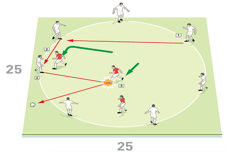 Spelet börjar med att bollen spelas upp i planen till det röda laget, som attackerar den första vågen av försvarare (grön) och försök att göra mål i målet som gröna försvarar. Så snart den första röda spelaren vidrör bollen rusar gröna ut för att försvara, men en av de stödjande anfallarna går in för att ge de röda angriparna en 4mot3-fördel. Efter att bollen har dött blir gröna angripare och spelet går nu i motsatt riktning med en ny attack. Varje våg av försvarare vänder sig för att attackera den motsatta änden när bollen har gått död och får ett startpass från nästa våg av försvarare. En stödjande anfallare kommer på att ge angriparna överbelastningen varje gång. Spela i 15 minuter.